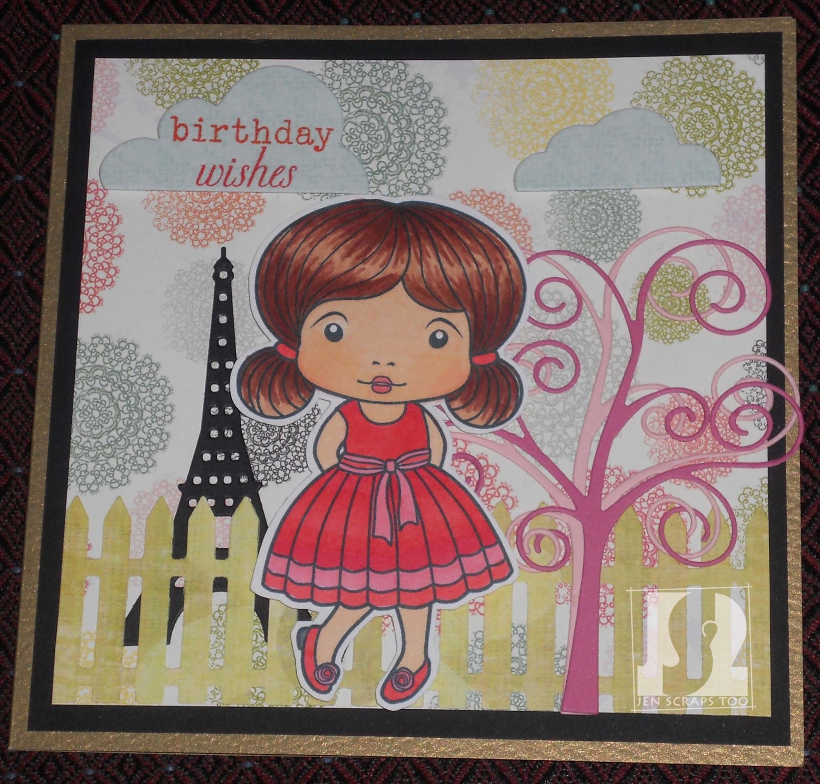 The image was coloured with Spectrum Noir markers and I have used Elegant Edges for the scalloped oval background. The papers are free papers that came in a scrapbooking magazine.